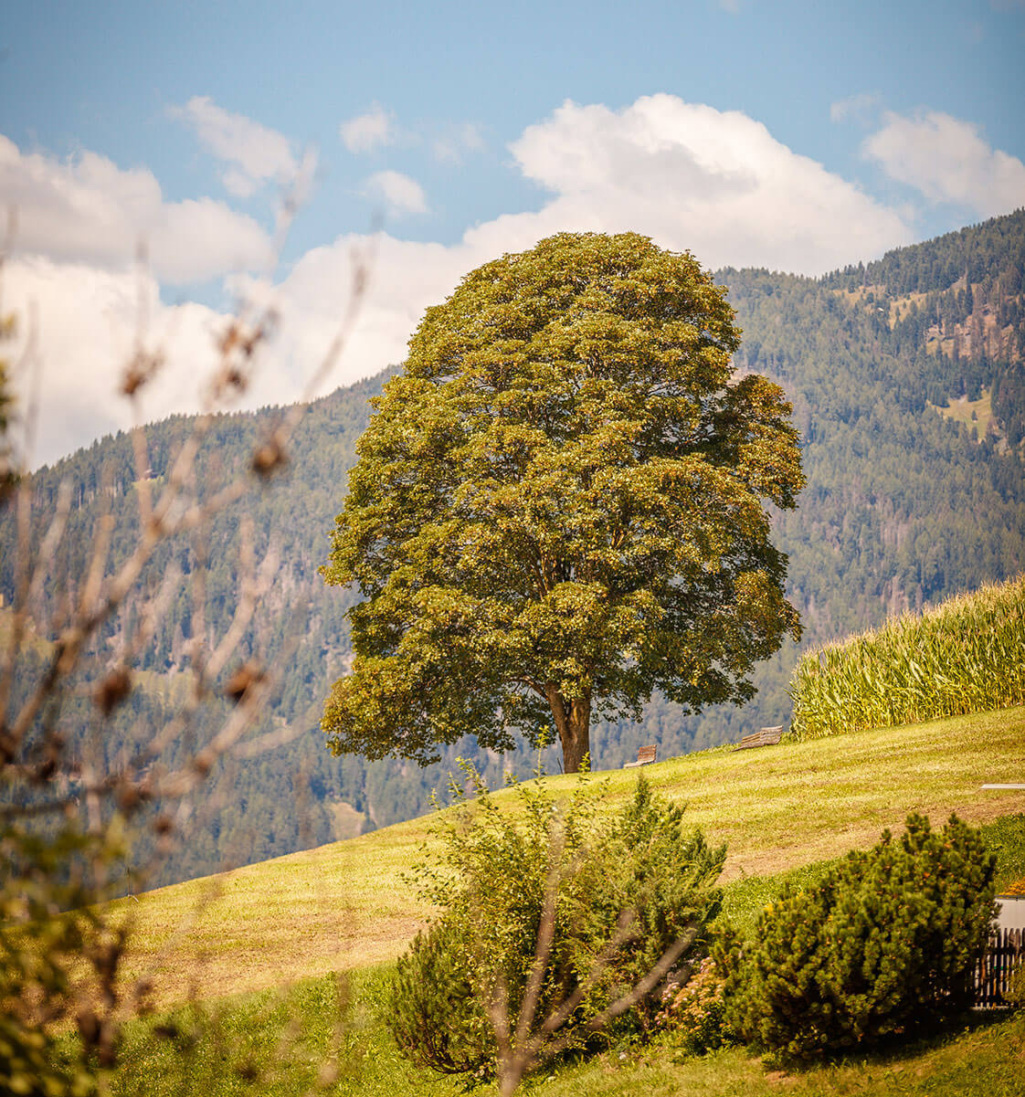 Sono molti i sentieri escursionistici che iniziano e terminano qui Fra questi, ricordiamo il cosiddetto “Helzl-Runde”. Partendo dall’albero, ci si inoltra nel bosco, per poi ritrovarsi nuovamente dietro il fienile. Qui avrete anche una splendida vista sul Castello di Chela. Il nome del sentiero, “Helzl”, deriva dal forte vento del nord che soffia a volte dalla Valle Aurina, seminando legnetti (legno = Holz, in dialetto Helzl) e pigne sui prati. Altri percorsi escursionistici vi condurranno a Villa Santa Caterina, al Castello di Chela, a Gais, Montassilone o sul Belcolle, splendido punto panoramico.